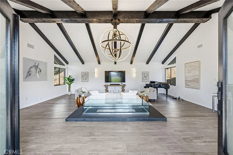 Built for sunsets! Hilltop views and stylish California living come together in this private Westlake Village estate. Perched at the top of a hill, this custom-built home offers refined style, privacy, open skies and sweeping sunset views in the idyllic Westlake Trails. A grand double-door entry opens to soaring, beamed ceilings, wide plank flooring and expansive walls of glass that fill the home with natural light and panoramic views from nearly every living space. Sleek and stylish contemporary finishes blend with warm California character, creating an atmosphere that feels sophisticated and relaxing. A grand scale living room with dramatic ceilings flows past a built-in bar and into the formal dining area, bordered by a wall of windows and glass capturing hillsides and sunsets. The open layout continues into an inviting kitchen and family room. The thoughtfully-designed kitchen, with oversized island, glass-front cabinetry and Carrara marble surfaces is equipped with high-end appliances including built-in espresso and wine refrigeration. A statement, full-height tiled fireplace anchors the family room, while sliding doors open to a veranda spanning the length of the home capturing golden light and sunset views. The flexible floor plan provides versatility with two-bedroom suites on separate levels, plus a large loft with en-suite bath and private balcony, ideal to create a fourth bedroom, office or studio. A private window-lined corridor leads to a tranquil primary suite filled with natural light, hillside views, private balcony and direct access to the pool terrace. The spa-inspired bath embraces an open, resort-style design with beautiful dark stone finishes, oversized shower and walk-in closet. Outdoor spaces throughout the property offer a variety of ways to relax, gather and take in the views. The expansive terrace and pool deck are perfect for capturing breezes, city lights and incredible views of summer fireworks, while a garden nook tucked into the hillside creates a quiet retreat. A three-car garage and expansive, long driveway provide ample parking and extra play space and a magnificent oak tree, with swings swaying from twisted branches, provide shade and storybook charm to this quiet retreat home. A peaceful hillside home designed for panoramic views, privacy and lifestyle perfectly situated in one of the most sought-after neighborhoods of Westlake Village.