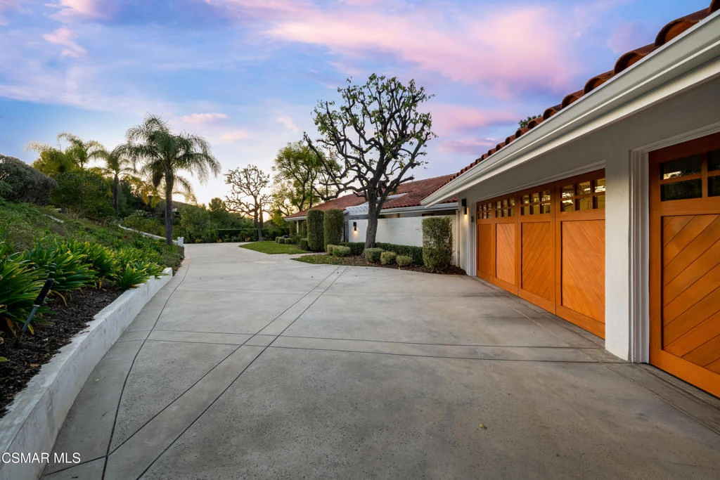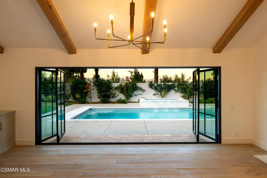 Gorgeous, fully upgraded single-story estate on a private 3/4-acre view lot in the charming, gated community of Los Robles Hills Estates. This beautifully renovated home offers exceptional curb appeal with lush landscaping, smooth stucco exterior, high-end Euroline black steel windows, sliders and accordion doors, contemporary lighting, and a gated front courtyard with paver hardscape.The dream entertainer's yard is a true showpiece--featuring sweeping views, a remodeled pool with motorized cover, brand-new spa, new hardscape, large grass areas, outdoor speakers, abundant fruit trees, and a large StruXure Pergola X motorized patio cover with built-in heating, fans, and lighting. Enjoy an outdoor kitchen equipped with a Hestan BBQ & side burner, refrigerator, and an outdoor fireplace. The smooth coat stucco privacy wall matches the home for a seamless, modern aesthetic. There is also large side yard with many fruit trees and herb garden. Inside, the sprawling one-story floorplan showcases an impressive chef's kitchen with quartz counters, Wolf, Miele & Bosch stainless appliances, glass lighted cabinets, a large island, two skylights, and a breakfast area that opens to the family room with custom fireplace. The expansive living room features a fireplace, high beamed ceilings, and fully opening steel accordion doors--perfect for indoor-outdoor entertaining. An office with high beamed ceiling & fireplace complements the four spacious bedrooms, including a stunning primary suite with views, custom cabinetry, wood floors, walk-in closet, quartz counters, dual sinks, a large frameless glass shower with rain head, and a soaking tub with a dramatic ceiling-fill feature.Additional upgrades include Euroline steel windows and doors throughout, wide-plank matte wood flooring, crown molding, updated bathrooms, two tankless water heaters, dual-zone HVAC, new recessed lighting and fixtures, built-in speakers in living and family rooms, 3 car garage with epoxy flooring and custom doors, closet organizers, and an oversized laundry/mud room with sink, wine cooler, and extensive cabinetry.Close to golf, hiking and biking trails, this is a gorgeous dream home offering privacy, views, luxury finishes, and premier indoor-outdoor living at its finest.