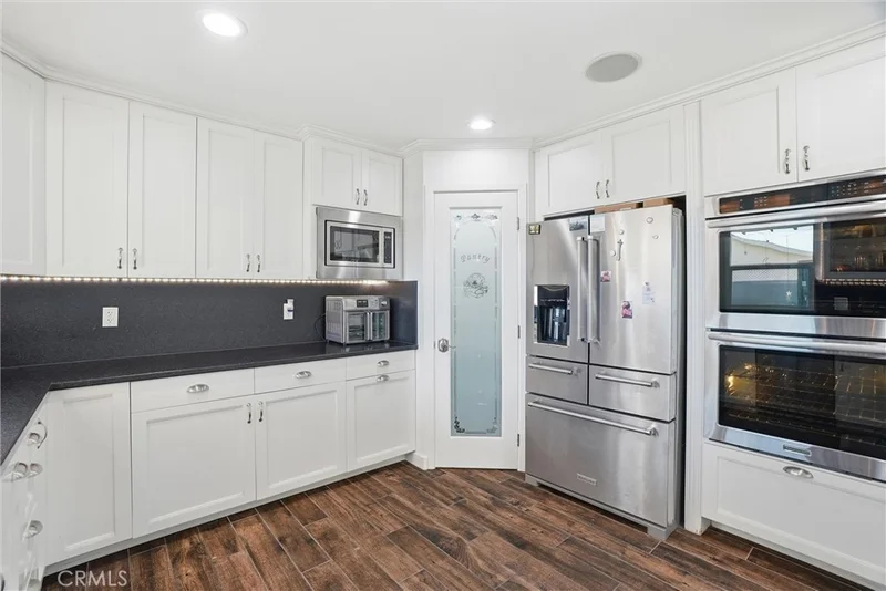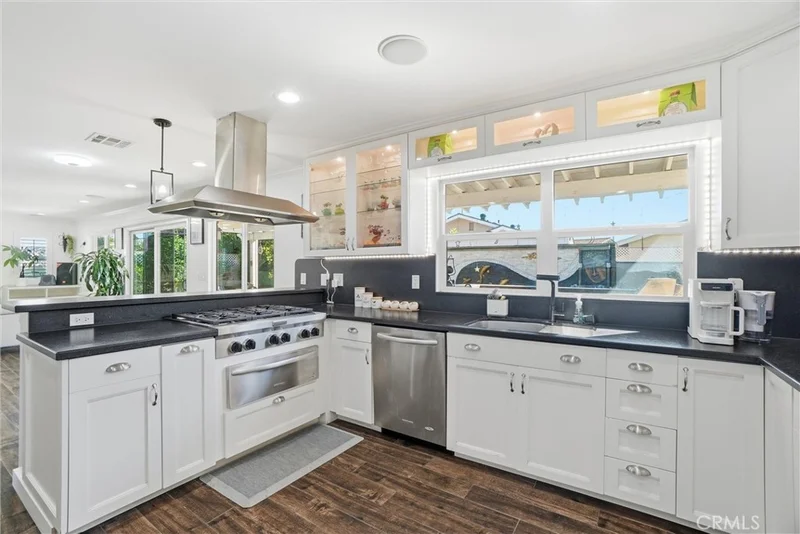 Tucked at the end of a quiet cul-de-sac, this spacious two-story home offers a thoughtful layout and quality updates throughout. The main level is filled with natural light and features porcelain tile flooring, recessed lighting, and an easy flow between the kitchen, dining, and living areas. The kitchen is designed for both function and style, featuring a six-burner range, stainless steel appliances, generous counter space, a breakfast bar, and a custom walk-in pantry. The living area is anchored by a stone-accented fireplace, creating a warm gathering space. A flexible room on the main floor works well as a home office, playroom, or additional living space. Oversized sliding doors open to a private backyard with a covered patio, built-in bar and grill area, open lawn, and mature fruit trees including orange and dragon fruit. Upstairs, the primary suite offers an updated bath with dual sinks, walk-in shower, and soaking tub. Three additional bedrooms share a refreshed hall bath. A custom media and family room completes the upper level with surround sound, a wall mural, and access to a private balcony. Located near local schools, shopping, dining, and everyday conveniences, with easy access to major freeways for commuting throughout Orange County.