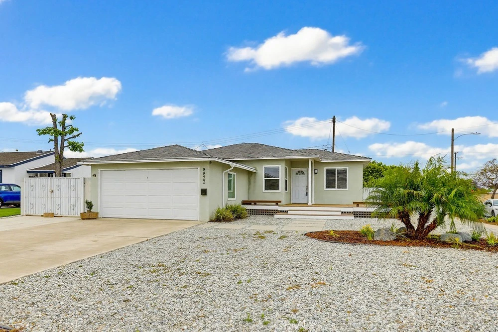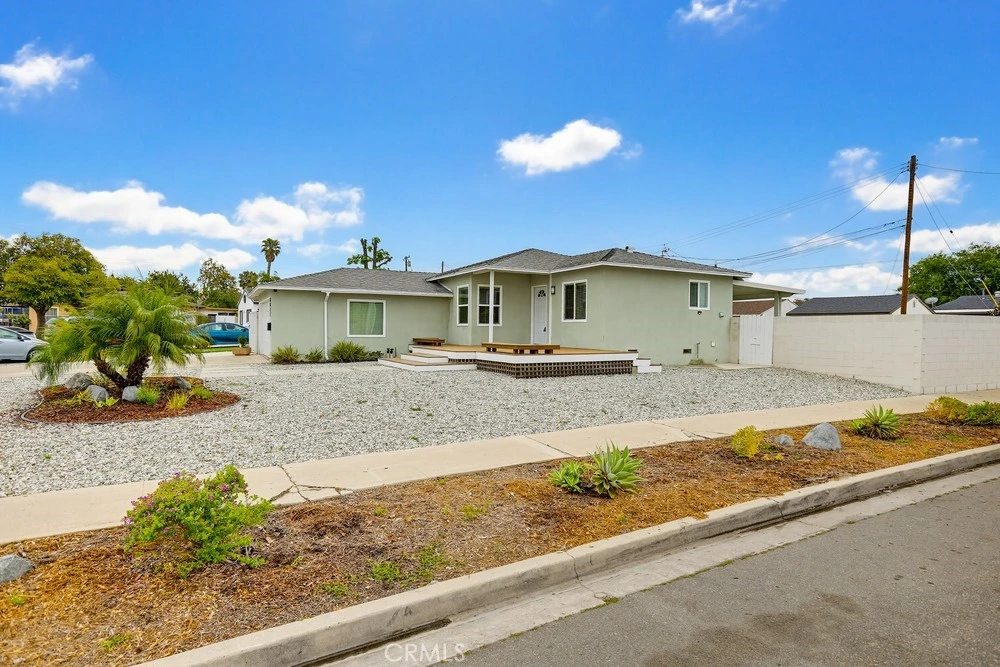 Mid-century Modern 3 bedroom with GREAT ADU & JADU POTENTIAL! Or 2 duplexes with SB 9! Oversized 7,526 square foot flat lot on a cul-de-sac AND street to alley AND corner lot and RV/boat parking. This maximizes options for ADU/JADU/SB 9 lot split. Beautiful updated home with large fenced backyard AND huge front yard and side yard ON A QUIET CUL-DE-SAC! Great home in wonderful location to move in immediately, plus add tons of value and living space with the expedited ADU/JADU/SB9 60-day plan approval! Friendly modern wrap-around entertainment deck. Immaculate backyard with pristine evergreen lawn and covered relaxation patio. Room for many fruit trees! Updated eat-in kitchen with Shaker cabinets, quartz counters and deep basin sink. The kitchen comes fully equipped with a premium stove, oven, microwave, and refrigerator. A washer and dryer are also included. The updated bathroom features modern finishes that complement the home's refreshed feel throughout. The property features an attached 2-car garage, offering convenient parking and additional storage space.