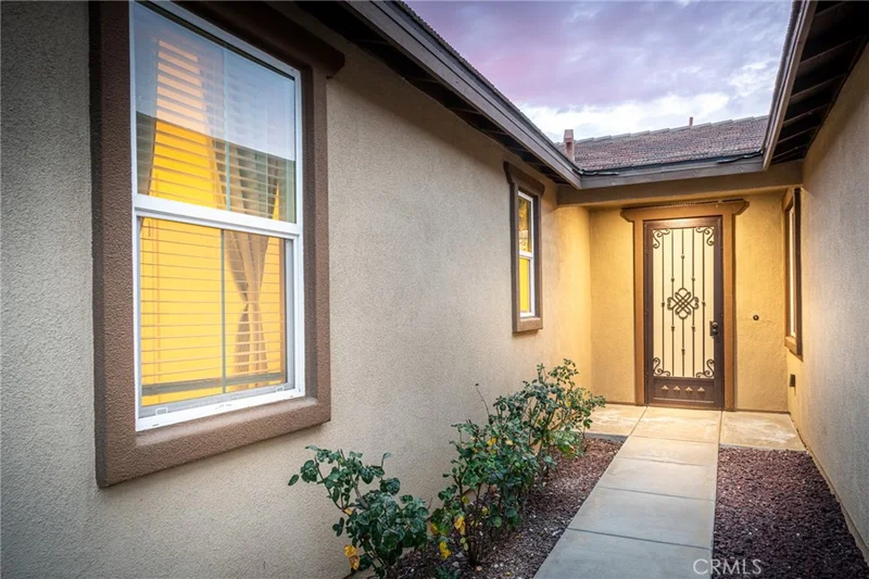Here’s the home you’ve been looking for! Single story + RV parking + Private Backyard with huge views! This beautiful home features a modern open-concept floor plan with beautiful plank flooring, contemporary kitchen with white "cape cod" style cabinetry, stainless appliances, slab granite counters and tastefully updated hardware including 3 beautiful pendent lights above the kitchen island and upgraded dining area light fixture. The large living area is perfect for modern living with the entire kitchen/family room/dining room joined together in one large area. The two secondary bedrooms are located up front and far from the master suite and feature ceiling fans and custom paint. The hallway features a large "flex room" that can act as a second living room for kids, an office, or whatever you might need the extra space for. The master suite features a large bathroom and a massive walk-in closet. The private back yard is huge and very private with no neighbors able to see into your yard and it features a spacious patio area, patio cover, artificial turf, large planter area and a storage shed. Perhaps the best part is the panoramic views to the west! This home also features a deep RV parking pad with lockable gate, and water/sewer hookups for your RV. The owner also pre-plumbed conduit and installed an outlet for 30AMP electric service (you will need to run wiring to complete.). Additional upgrades include a Quiet Cool whole house exhaust fan to help save on A/C costs in the summer; custom security doors, additional garage storage, window shutters along with custom interior paint. Built in 2017 this home sports loads of energy efficient features and tankless water heater. Located in Heritage Ranch, this home is close to walking trails, a sports park and is just minutes from shopping and freeway access as well as walking distance to the Menifee School District's coveted Harvest Hills STEAM Academy. Hurry, this highly desirable property won’t last! INQUIRE WITH LISTING AGENT ABOUT ASSUMABLE FHA LOAN AT 2.8%!!