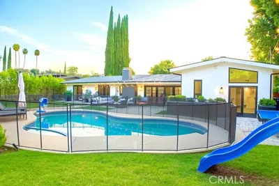 Beautifully remodeled 4 bedroom, 3 bathroom home in prime neighborhood in Woodland Hills. This spacious one story boasts a bright open floor plan, a large kitchen with stainless steel appliances, granite countertops, custom cabinetry, center island and open to dining room. The living room has a garden view, elegant fireplace and sky lights. Primary bedroom has high ceilings, garden and pool views, large en-suite bathrooms with separate shower and soaking tub and plenty of closet space. The home has a second ensuite bedroom with remodeled bath, and walk in shower. Newer laminate flooring throughout. Spacious back yard with low maintenance artificial grass and a large private pool, recently re-plastered. Located within close proximity to freeway, Westfield shopping center and parks.