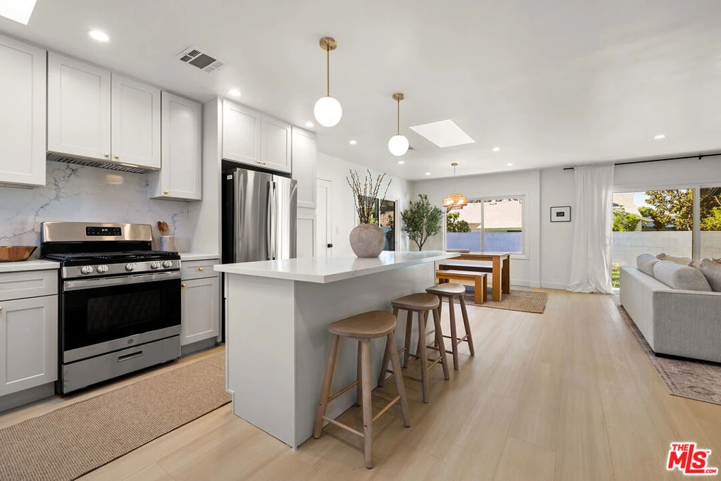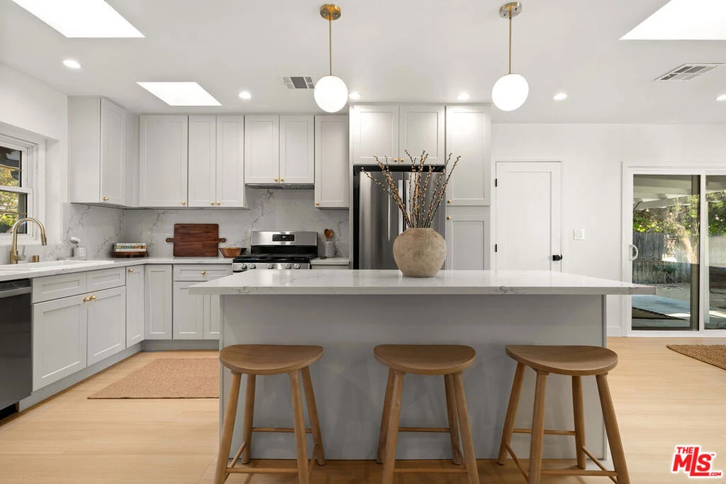 Tucked away at the end of a quiet cul-de-sac in a highly desirable pocket of Woodland Hills, just moments from Walnut Acres, this thoughtfully reimagined single-story residence blends modern design with effortless California living. The home features 3 bedrooms and 2 bathrooms, all brought together by a bright, open-concept layout designed for both everyday comfort and seamless entertaining. Every detail has been carefully curated, showcasing quality craftsmanship and elevated finishes throughout. The primary suite serves as a private retreat, complete with a beautifully redesigned bathroom featuring floor-to-ceiling tile, dual vanities, custom cabinetry, and a spacious walk-in shower. A generous walk-in closet adds both function and luxury. Two additional bedrooms and another redesigned secondary bath offer flexibility for family, guests, or a home office. At the heart of the home, the kitchen is both stylish and functional, equipped for those who love to cook and perfectly positioned to connect with the dining area and center island, creating a natural gathering space. Set on an approximately 6,700 square foot lot, the outdoor space is designed for easy living and entertaining. The backyard features a mix of decomposed granite, gravel, garden boxes and large grassy yard, offering multiple areas to relax from evenings around the fire pit under string lights to covered patio dining year-round. Extensive upgrades include a new HVAC system, Google Nest Thermostat, updated electrical panel, new roof and gutters, luxury vinyl flooring, and a two-car garage with direct access.Ideally located near premier shopping and dining at Westfield Topanga & The Village, The Commons at Calabasas, and Warner Center, with access to top-rated charter schools including El Camino Real Charter High School and George Ellery Hale Charter Academy. A beautifully renovated turnkey opportunity in one of the Valley's most sought-after neighborhoods offering style, function, and location all in one.