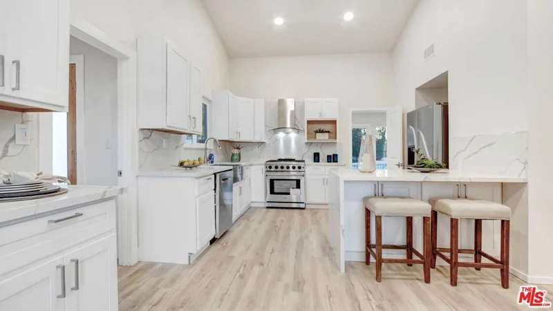 This four-bedroom, two-bath single-story ranch-style home offers privacy and thoughtful design, surrounded by mature landscaping. The interior features a light, neutral palette and an open layout, with expansive windows that bring in abundant natural light and frame views of the outdoor space.The kitchen is equipped with state-of-the-art appliances, white shaker cabinetry, and marble-style backsplash and countertops. A dedicated laundry room adds everyday convenience.The backyard has been transformed into a private outdoor area ideal for entertaining or relaxation. A detached garage with rear-panel access provides flexibility and may be repurposed for a variety of uses, including potential flex space.Located on wide, flat streets with easy access to nearby nature and walking areas, this home combines functionality with a desirable location.