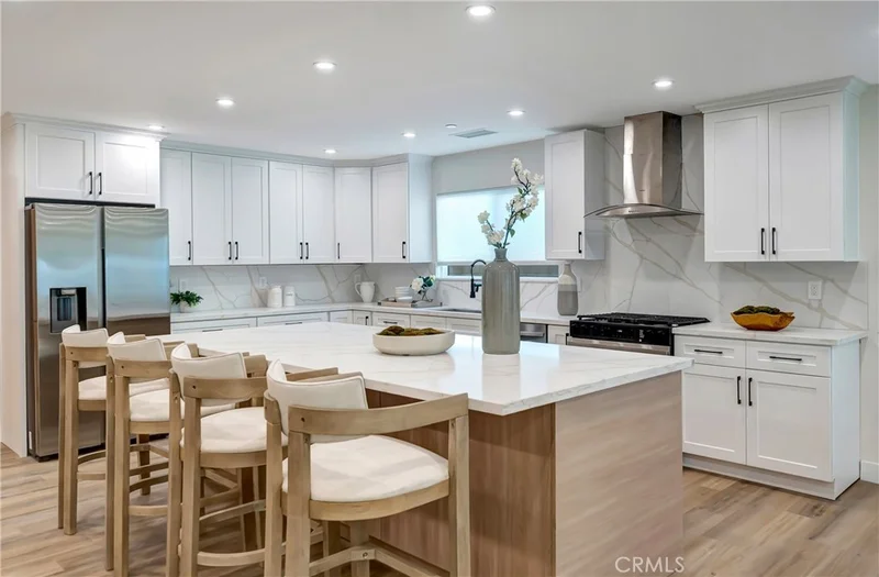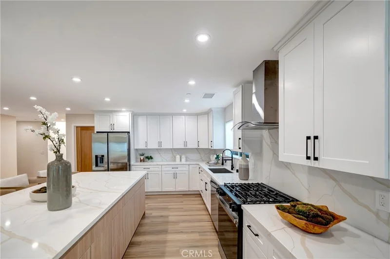 Extensively remodeled and expanded with permits. Woodland Hills residence offering approximately 2,750 sq ft of living space, including about 1,600 sq ft of newly constructed addition. All remodels and additions were completed with permits. The property also features approximately 352 sq ft of permitted patio and porch space recognized by the City but not included in the MLS square footage. Open floor plan connecting the living, dining, and kitchen areas, ideal for modern living and entertaining. The kitchen features a large quartz island, custom cabinetry, stainless steel appliances, gas range, and contemporary finishes. The spacious 4-bedroom, 2.5-bathroom layout includes a primary suite with backyard access, a walk-in closet, and a spa-style bathroom with a walk-in shower. Additional bedrooms offer comfortable space and natural light. Major upgrades include new electrical system and panel, copper plumbing and gas lines, HVAC with new ducting, roof, insulation, drywall, stucco, windows and doors, fire sprinklers, and tankless water heater. Private backyard with covered patio and grassy yard. Located near Valley Circle Blvd and Vanowen St in a quiet residential neighborhood within a desirable school district, with convenient access to Warner Center, The Village at Westfield Topanga, Westfield Topanga Mall, parks, hiking trails, the 101 Freeway, and a short drive through Topanga Canyon to Malibu beaches. Certificate of Occupancy to be delivered.