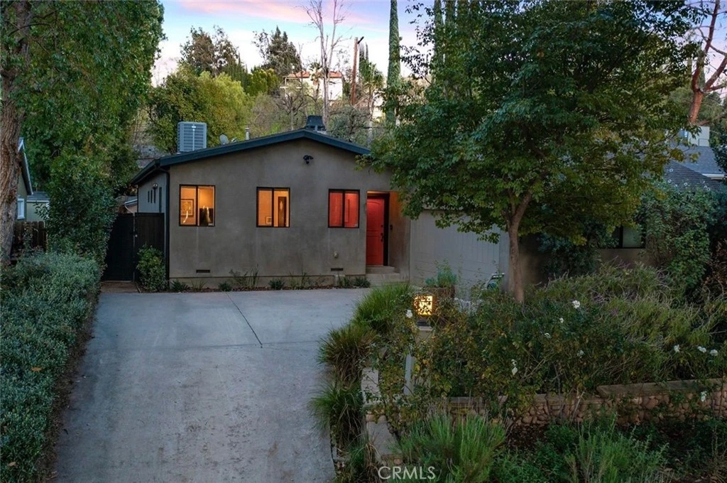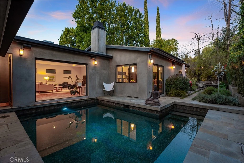 Immaculate California contemporary showstopper with separate studio/office/bonus room! Complete ground up reconstruction designed by Busch Design Build, renowned for award-winning green and sustainable architecture. Upon entering the property, you are greeted by a handmade front door that opens to a private courtyard with swimming pool. Step inside the home to find reimagined interiors featuring pitched ceilings, built-in speakers, Milgard aluminum windows, custom shades for optimal light and privacy, and brand new flooring. The spacious living room has floor to ceiling built-in bookshelves, smooth stucco fireplace, and is highlighted by an expansive Fleetwood sliding pocket door with full screen that opens directly over the swimming pool artfully combining indoor/outdoor living. Frosted glass pocket doors open off the living room to a separate guest bedroom/office with built-in desk, storage closets, & spa-like bathroom with teak wood flooring & terracotta smooth stucco walls. The oversized kitchen overlooks the backyard and features custom soft close cabinets, pantry pullout storage, stone counters, and stainless appliances. A dining space off the kitchen with a sliding glass door leads to an outdoor patio perfect for alfresco dining. The primary suite is truly a sanctuary featuring French doors that open onto a private patio overlooking the backyard, a large walk-in closet with custom built-ins, and a luxurious en-suite bathroom with one-of-a-kind Mongolian vanities, Victoria + Albert bath tub, and unique walk-in shower with green onyx tiling. This artistic retreat boasts a detached studio with pro-grade sound proofing, custom low noise HVAC system, private bathroom, and overlooks a front garden with mature lush landscaping. This space can alternatively be used as a home office or guest quarters. The idyllic grounds feature PebbleTec black onyx swimming pool with bluestone deck & covered patio, sprawling garden conceived by The Great Outdoors Landscape Design with drought tolerant & native plants, 4 person Swedish barrel sauna, & large patio with custom gas fire pit. Eco-living features include high efficiency cellulose wall insulation, solar system, full house water filtration and AccuClean® HVAC whole-home air cleaner. Desirably located south of Ventura Blvd adjacent to Topanga Canyon shops/eateries, Westfield Topanga Mall/Village, Warner Center, hiking trails and minutes to Malibu. Don’t miss this spectacular offering.