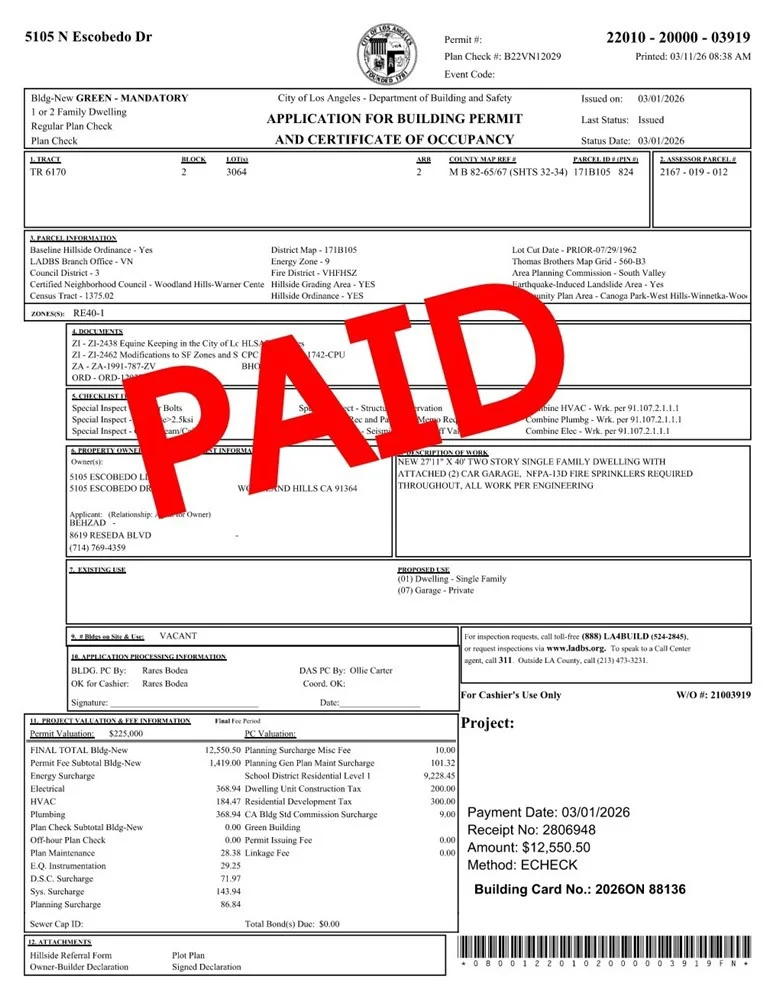 PERMITS HAVE BEEN PAID! START YOUR CONSTRUCTION TOMORROW AND TAKE ADVANTAGE OF APPROVED PLANS BASED ON THE 2020 CODES AND NO REQUIREMENT TO COMPLY WITH THE 2025 CALIFORNIA WILDLAND-URBAN INTERFACE CODE. Approved plans for a luxurious, modern 3 bedroom, 2 bathroom, 1800+ sqft home with an attached two-car garage complete with a balcony providing magnificent views. This vacant lot sits on a quiet street just south of Ventura Boulevard, surrounded by beautiful homes and scenic canyon views. Location, location, location. Take advantage of this stunning opportunity!