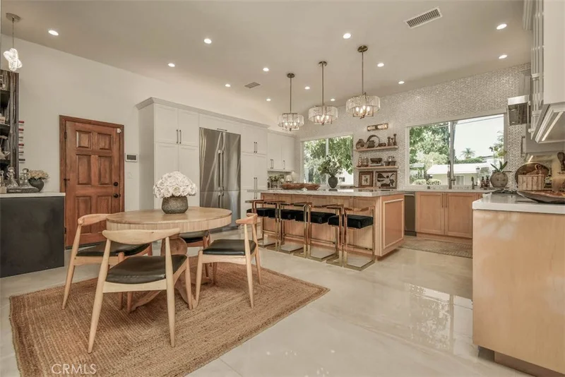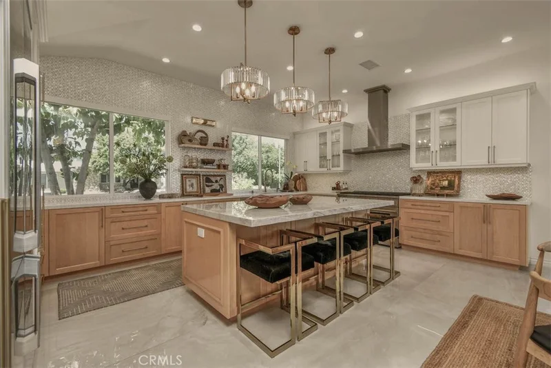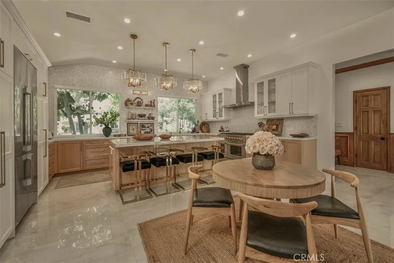 Discover your own private oasis in this meticulously crafted, thoughtfully designed Charles Dubois home! Nestled on a peaceful cul-de-sac and boasting expansive panoramic views, this beautifully updated home offers an unparalleled living experience. Step through the stunning glass mosaic front door into a world of refined sophistication. High ceilings and custom walnut wood detailing creates warmth and character. Large slab imported Italian porcelain flooring throughout living areas and kitchen. The heart of the home features an open concept kitchen equipped with high-end stainless appliances. An oversized Brazilian quartzite island and brass chandeliers make a showstopping focal point, and are the perfect compliment to the exquisite real pearl tile backsplash and premium LumaTaj quartz countertops. The spacious primary suite features a large walk-in closet and a spa-like bathroom with dual sinks, freestanding tub and oversized shower. Wake up to a magical view of the sunrise over mountains each morning! Two additional bedrooms share a jack-and-jill bathroom, while a flexible fourth bedroom/2nd primary with full bathroom offers many possibilities for your lifestyle. Set it up as a guest bedroom, family room, TV area or a media/game room. A separate laundry room is equipped with side by side, brand new washer and dryer. Your backyard offers a resort-style sanctuary with spectacular skyline and mountain views! A saltwater heated pool and jacuzzi is perfect for year-round enjoyment. Two gas fire pits create intimate gathering spaces, and the thoughtfully designed landscape includes an enchanting garden with old English roses. Hummingbird and pollinator-friendly plantings create a living ecosystem, while the newly installed drought-tolerant front landscaping with minimal drip irrigation reflects both beauty and water conservation. This home embraces both luxury and sustainability with solar energy, a new roof, and dual zone HVAC systems. Wired for ADT security and Ring devices. 2 car garage with direct kitchen access. Located in a family friendly and highly sought after neighborhood, zoned to top rated schools El Camino, Hale, and Lockhurst. Just minutes from the Calabasas Commons and Westfield Mall and 30 minutes away from the stunning beaches of Malibu. Experience the perfect fusion of tranquil sanctuary living with modern convenience in this extraordinary home!
