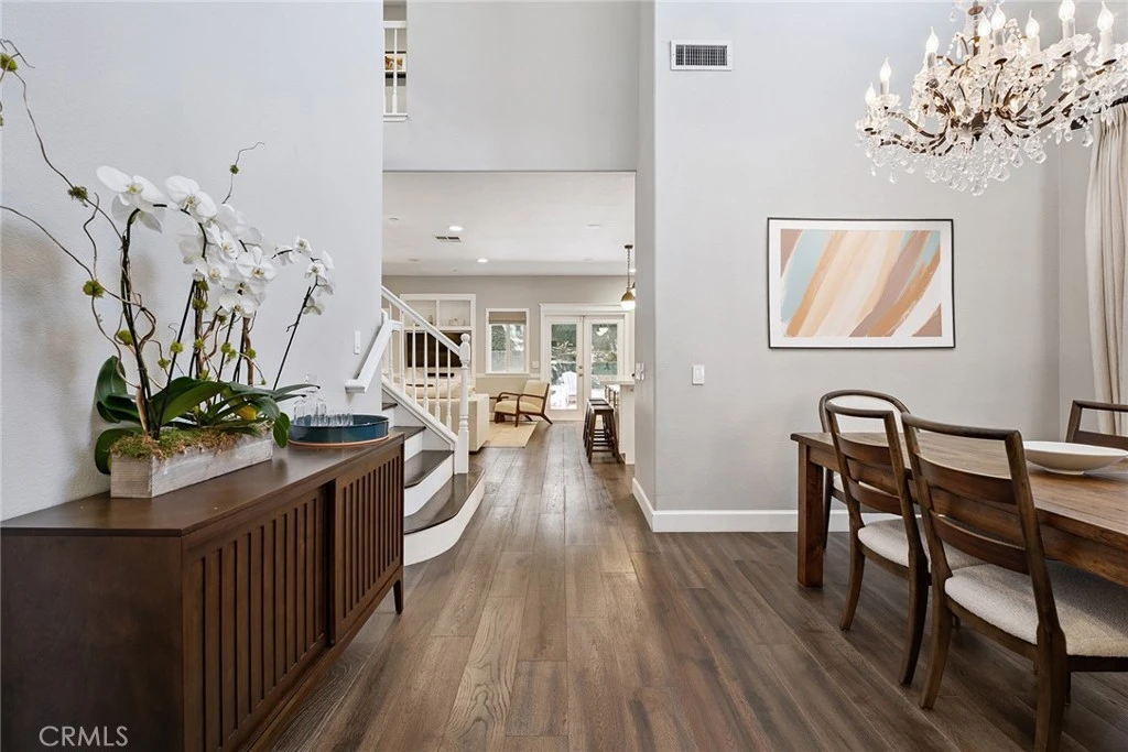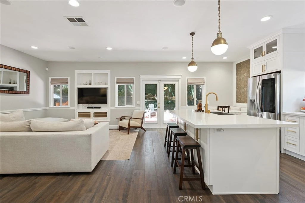 South of the boulevard gorgeous remodeled home originally built in 2002 located at the end of a cul-de-sac. Elevated above the street, the front yard features large covered front porch, mature landscaping, and driveway that leads to the 2-car garage with direct access. Step inside to find a completely open floor plan with designer finishes and custom details. The formal living room features a wood mantled fireplace, large picture window overlooking the front yard, and wide plank wood floors found throughout. A separate formal dining room has two-story soaring ceiling with direct kitchen access. Chef’s gourmet kitchen boasts center island with breakfast bar seating, quartz counters with custom soft close cabinetry, stainless appliances, pantry space with pullout drawers, and breakfast nook with built-in bench seating with additional storage. The kitchen opens directly to the separate spacious family room with French doors that open to the backyard. The first floor also features a downstairs bedroom ideal for guests or office space with access to a remodeled hall bathroom with walk-in shower. A separate laundry room has built-in storage cabinetry and access to the 2-car finished garage with overhead storage racks. Upstairs you will find three additional bedrooms plus an oversized loft/work space with built-in desks and storage - perfect flex space for play room/gym/etc. The luxurious primary suite is located on a private wing boasting double door entry, high vaulted ceiling, walk-in closet with second additional wardrobe closet, and en-suite remodeled bathroom with custom vanity with dual sinks, quartz counter, built-in linen storage, soaking tub, walk-in shower, and separate toilet room. The two well appointed secondary bedrooms each have closets with built-ins and they share a remodeled hall bathroom with custom vanity, dual sinks, bath tub, and shower. The private backyard features large patio with overhead string lights perfect for entertaining and dining alfresco, built-in gas fire pit, & lush landscaping with mature trees that provide wonderful shade. Adjacent to dining & shopping at the Calabasas Commons, nearby markets including Bristol Farms & Trader Joes, close proximity to the Westfield Mall/Village & Warner Center, and zoned for highly acclaimed Calabash elementary, Hale and El Camino charter schools.