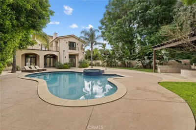 WELCOME TO THIS STUNNING PRIVATE GATED ESTATE, equipped with Generac Generator and featuring a sprawling 40-foot by 15-foot bonus room that can be transformed into a music studio, home theater, gaming space, or playroom built in 2022. Step through the elegant entryway and into a spacious, sun-filled interior where French sliding doors connect the main living area to a large, shaded patio and private yard—an entertainer’s dream. The gourmet kitchen is the heart of the home, featuring a massive center island, premium appliances, and a seamless flow into the inviting family room – all tucked away on nearly 15,000 square feet of beautifully landscaped grounds, this remarkable home offers over 5,200 square feet of open-concept living space, ideal for entertaining and everyday living. Main level luxurious primary suite with a spa-inspired bath complete with a free-standing soaking tub, separate shower, and generous walk-in closet. Two additional oversized bedrooms and a convenient laundry room—equipped with a new Samsung washer and dryer—complete the main floor. Downstairs includes two additional ensuite bedrooms, perfect for guests or a home office with direct entry from the oversized six-car garage with 220V EV charging - along with the 40-foot by 15-foot bonus room. Water-efficient, drought-tolerant landscaping - gardener service included. Zoned for award-winning El Camino and Hale charter schools, and close to dining/shopping at The Commons & Westfield Mall & Village.…and MUCH MORE.