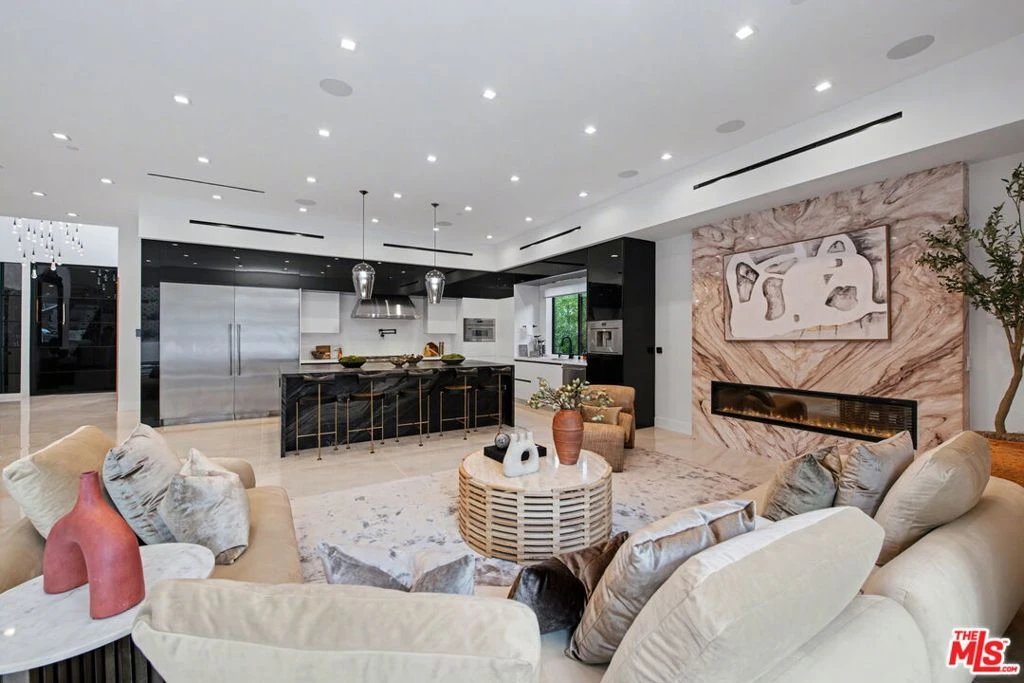 Welcome to this striking modern residence in the heart of Woodland Hills, where sleek architecture, smart home technology, and seamless indoor-outdoor living come together in perfect harmony. Privately gated and newer built, this thoughtfully designed home offers 3 bedrooms, 3.5 bathrooms, and a flexible layout ideal for both everyday living and elevated entertaining. Step inside to soaring ceilings and an expansive open-concept floor plan that effortlessly connects kitchen, living room, family room, and formal dining area. Walls of glass and disappearing pocket doors create a true indoor-outdoor experience, flooding the home with natural light while opening directly to the resort-style backyard. The outdoor space is a private oasis, featuring lush grassy areas, multiple seating and lounge spaces, and a stunning pool and spa with a tranquil waterfall feature. Entertain with ease in the fully equipped gazebo complete with dining area, built-in BBQ, and pizza oven perfect for hosting unforgettable gatherings year-round. The main level includes two spacious en-suite bedrooms along with a stylish powder room, offering comfort and privacy for guests or family. Upstairs, the primary suite serves as a true retreat, complete with a spa-like bathroom and an expansive walk-in closet. A separate upstairs space ideal as a home office, media room, or additional family lounge adds flexibility without being tied to the primary suite. Adding to the home's versatility, the current formal dining room was originally designed and approved as an en-suite fourth bedroom, offering the opportunity for an easy conversion back to a 4-bedroom, 4.5-bath layout upon buyer's request. Designed for modern living, the home is equipped with smart home features, clean contemporary finishes, and a cohesive aesthetic throughout. With its prime Woodland Hills location, gated privacy, and exceptional indoor-outdoor flow, this home delivers the perfect blend of luxury, functionality, and the California lifestyle.