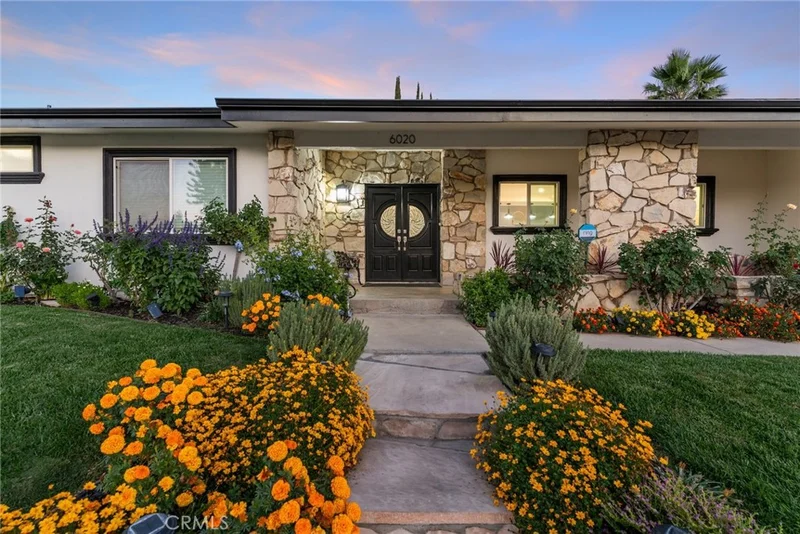Meticulous and highly upgraded mid-century modern Charles Du Bois single level home with attached guest apartment with separate kitchen! The property sits elevated above the street on a sprawling 11k lot boasting almost 100 feet of frontage adorned with manicured front lawns and lush landscaping. An ascending stone pathway leads to the covered front porch cladded with original stone exterior. Step through double doors into the entry foyer that opens to expansive living & dining rooms each with tongue & groove wood beamed vaulted ceilings, original stone fireplaces, and glass sliders that open to the backyard for the perfect indoor/outdoor flow. The oversized remodeled kitchen boasts large island with breakfast bar seating, quartz counters with soft close custom cabinetry, wine fridge, and a suite of Forno gourmet stainless appliances including a 60” fridge/freezer and built-in range with double ovens and 8-burner stove with pot filler. The spacious primary suite features high vaulted ceiling, glass slider that opens to the yard, large walk-in closet, separate makeup vanity, and en-suite upgraded bathroom with dual sinks, spa tub, and separate walk-in shower. One bedroom wing has the primary suite and two additional secondary bedrooms each with high vaulted ceilings and they share a spacious remodeled bathroom with new vanity with stone counter, dual sinks, and walk-in shower. There is a separate wing/guest apartment of the home which has both interior and exterior access making it the ideal flex space for extended family, home office/studio space, or great rental income featuring two additional bedrooms, full kitchen with stainless appliances, full bathroom with dual sinks and walk-in shower, and fenced private yard with patio, grass lawn, and storage shed. The home also has a spacious laundry room with built-in storage. The entertainer’s backyard has a sweeping covered patio perfect for outdoor dining and lounging, lush grass lawn with mature trees, and large side yard with additional storage shed. Adjacent to dining/shopping at the Westfield Mall/Village, Calabasas Commons, local parks/hiking, & zoned for award-winning El Camino & Hale charter schools.