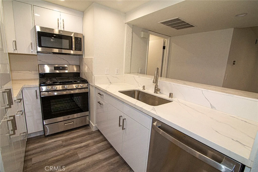 Open and bright single-level condo located in the highly desirable, guard-gated Warner Woodlands community in the heart of Warner Center. This beautifully appointed 2-bedroom, 1-bath condominium offers exceptional privacy, abundant natural light, and refined finishes throughout. The inviting living space features elegant laminate flooring, a decorative fireplace, and access to a private balcony perfect for relaxing or entertaining. The modern kitchen is equipped with new stainless steel appliances, a gas cooktop, gleaming granite countertops (no refrigerator), and a newly installed water heater. For added convenience, the home includes an in-unit washer and dryer. The spacious primary suite is thoughtfully designed with a sitting area or home office, dual closets, and a well-appointed bathroom with double sinks. A private two-car garage provides secure parking along with additional built-in storage. Residents enjoy resort-style amenities, including a sparkling pool, spa, tennis court, and beautifully maintained grounds. Ideally located just moments from The Village and Westfield Topanga, as well as premier shopping, dining, entertainment, and outdoor recreation, this home offers the perfect blend of comfort and convenience. Don’t miss this exceptional opportunity to own in one of Woodland Hills’ most sought-after communities.