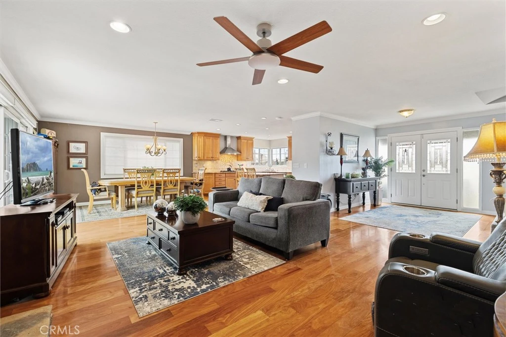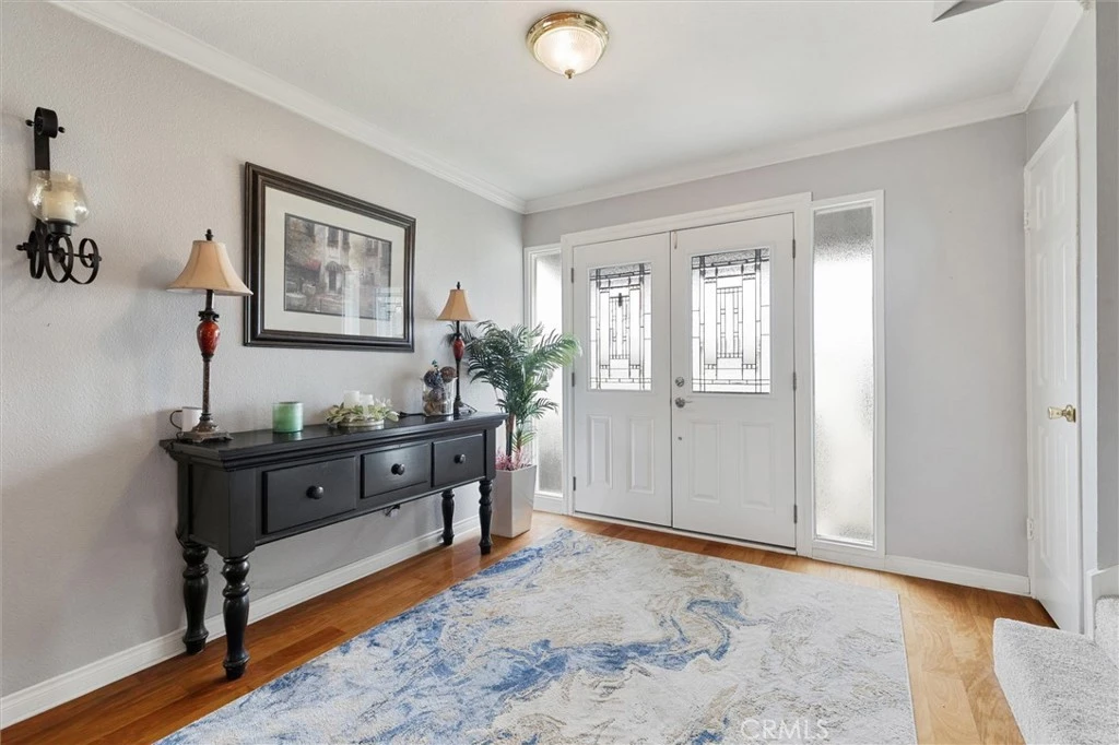 Popular split level 4 BEDROOM POOL HOME with lots of upgrades! Double door entry into a welcoming foyer ~ Open floorplan with lots of windows and natural lighting set the tone for this popular layout ~ Lots of upgrades include wood flooring, crown molding, dual paned windows, recessed lighting, custom window coverings, ceiling fans and newer carpeting! Large living room with fireplace opens to formal dining room that is perfect space for entertaining lots of guests! Remodeled kitchen feature granite counters, gas cooktop, vent hood, pantry, stainless appliances and convenient center island for casual dining ~ Downstairs features a huge family room that opens to the rear yard ~ Guest bath and laundry room with outdoor access ~ Upstairs features a master bedroom with remodeled bathroom ~ Additional bedrooms are ample in size and share a hall bathroom ~ Easy outdoor entertainment in this back yard! Lots of seating area around a sparkling pool that has been re-plastered and retiled ~ Beautiful pavers, garden areas and artificial grass make this a low maintenance yard ~ Other upgrades include a newer roof, exterior paint, A/C and furnace! This is a home of space and comfort!