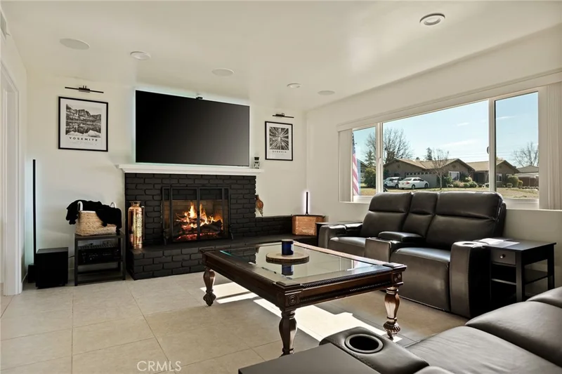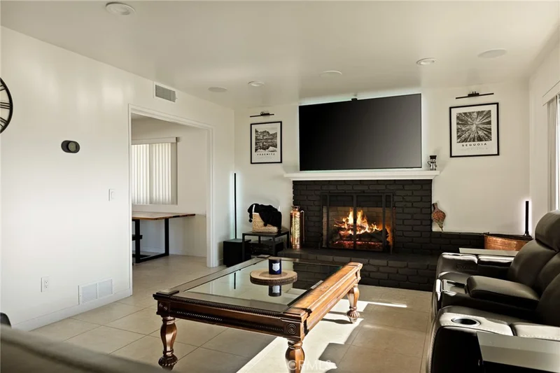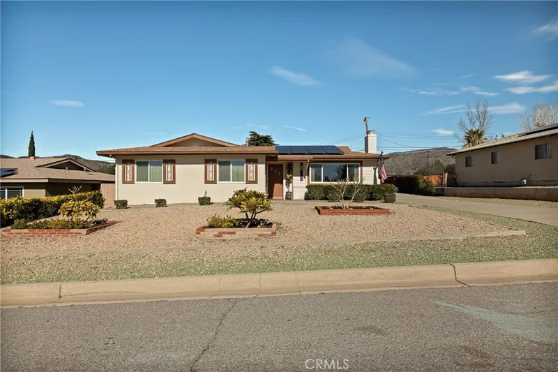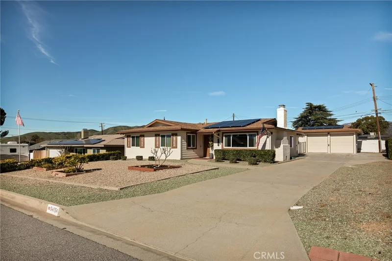 Beautifully updated single-story home on a quiet street in desirable upper Yucaipa. The inviting living room with cozy fireplace flows into the open eat-in kitchen and enclosed patio/sunroom, creating a bright and functional layout. The kitchen features freshly painted cabinetry, modern appliances, and sleek countertops. The home offers three well-sized bedrooms and two updated bathrooms with dual-sink vanities, Toto toilets, and contemporary finishes. Recent upgrades include scraped popcorn ceilings, all LED lighting and fixtures, new vinyl plank flooring in the bedrooms, and fresh interior paint. The fully fenced backyard offers a flat grassy lawn with app-controlled string lights and permanent exterior holiday lighting on the home and garage Major system improvements include a new 200-amp main electrical panel, all-new copper plumbing from the street, solar, a garage sub-panel, and two 50-amp NEMA 14-50 outlets in the detached oversized two-car garage—ideal for RV or EV charging.