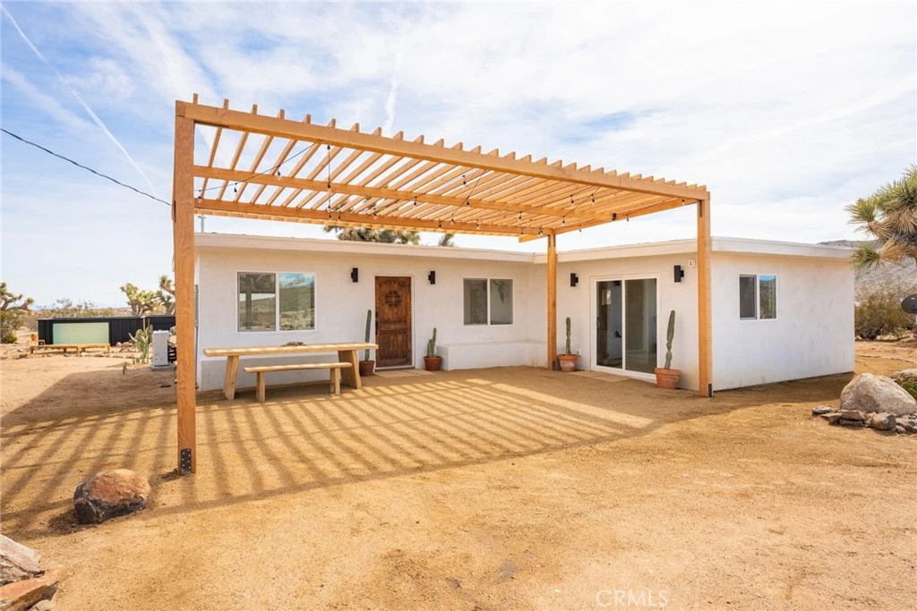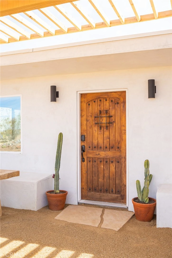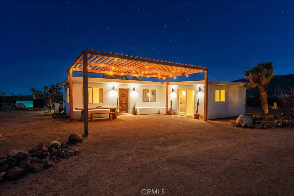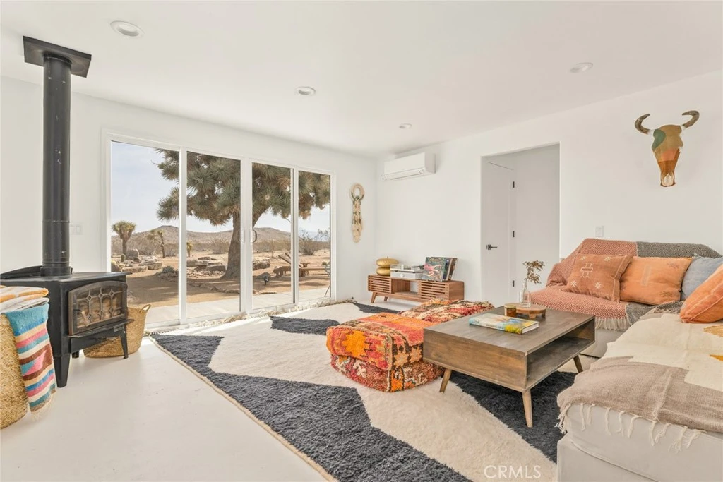Welcome to SunDream, Yucca Valley. Set on five acres of open desert, SunDream captures over 100 miles of uninterrupted panoramic views. A glass pool, oriented east to west, is positioned to catch the shifting light at both sunrise and sunset. From here, snow-capped peaks in Big Bear rise to the north, while the High Desert stretches endlessly below — nothing between you and the horizon but Joshua trees that have stood for over a century. The home, offered fully furnished, is intentional in both design and experience: two bedrooms, one bath, with every room oriented toward the surrounding landscape. Five custom sliding glass openings dissolve the boundary between indoors and out, allowing the desert to become part of the living space. The living room centers around a wood-burning fireplace and a deep-seat Lovesac “Cloud” sectional, offering both comfort and additional sleeping accommodations for a third guest. A hidden secondary bedroom is revealed behind a bookshelf door, furnished with a Casper queen bed and framed views of the eastern mountain range. The primary suite features a king-sized Casper bed and opens directly to an outdoor, eco-conscious desert shower finished with flagstone underfoot and biodegradable soaps, designed so water nourishes the surrounding succulents. The bathroom is a statement of its own — pink tile, warm gold fixtures, a soaking tub, and dual showers — creating a spa-like retreat to unwind after a day exploring the desert. The front patio and outdoor dining area, accessible from both the kitchen and living room, are immersed in a stillness so complete you’ll notice even the subtle shift of the wind. Don’t miss this opportunity to own this beautiful desert sanctuary!