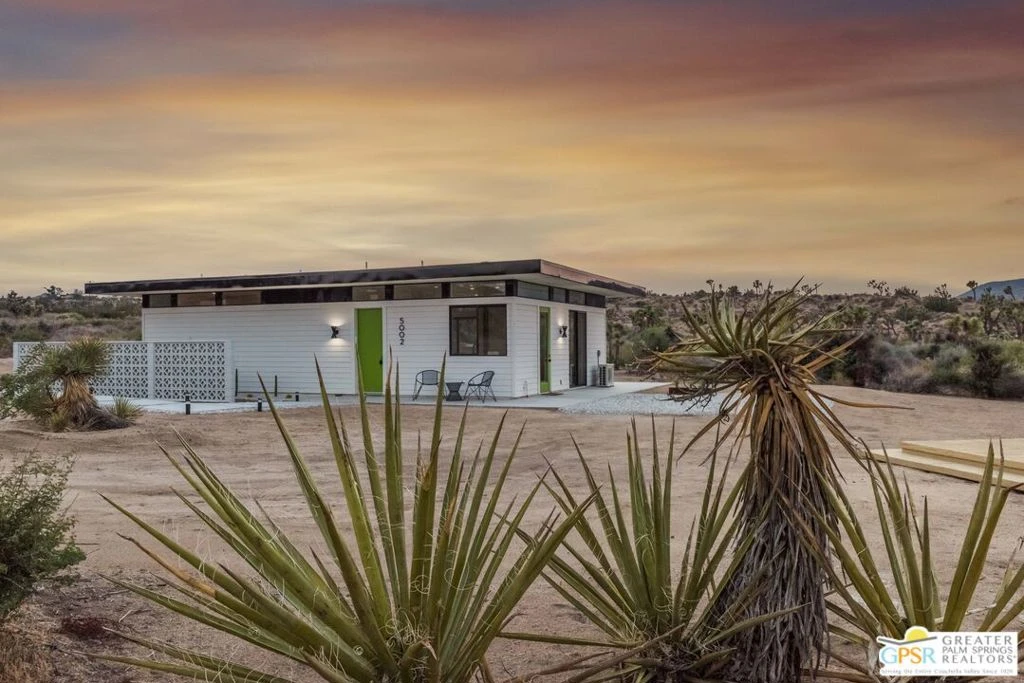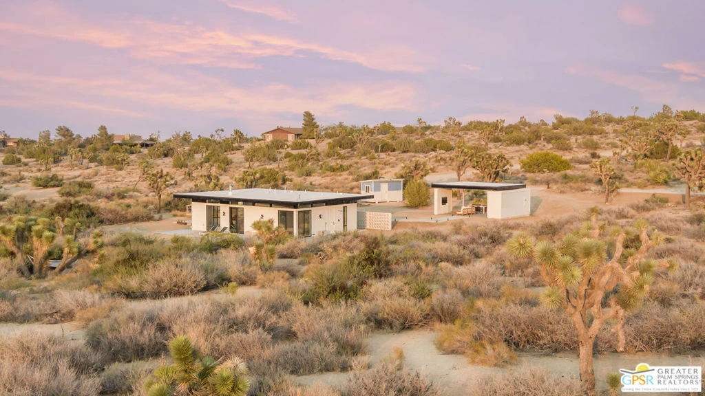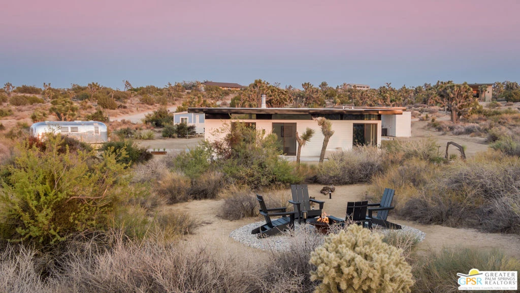 Amazing opportunity--one of a kind, one owner custom built by architect Cioffi as a High Desert retreat sited on nearly 2.5 acres of stunning and natural desert landscape featuring abundant flora and mesmerizing Mt. San Gorgonio views. Property is a proven and successful cash generating vacation rental with pride of ownership abounding. Stunning Mid-Century Modern influenced finishes and embellishments, 5-star hotel quality baths and an abundance of natural light. Outdoors you will enjoy the covered entertainment pavilion with full kitchen and dining space for family & friends and the included hot tub for nights of stargazing. The fully outfitted chef's kitchen offers refined cabinetry, quartz countertops and upscale appliances. High ceilings, clerestory windows and views from every room. House your guests in the included 1968 Vintage solar powered Airstream which is connected to septic, propane and water. This low-maintenance property is a perfect full time, second home or investment property. The very private setting is easily accessible to Palm Springs and Los Angeles. A magnificent and rare escape. Some furnishings and art available outside of escrow.