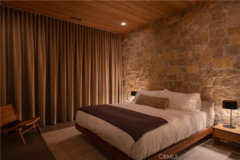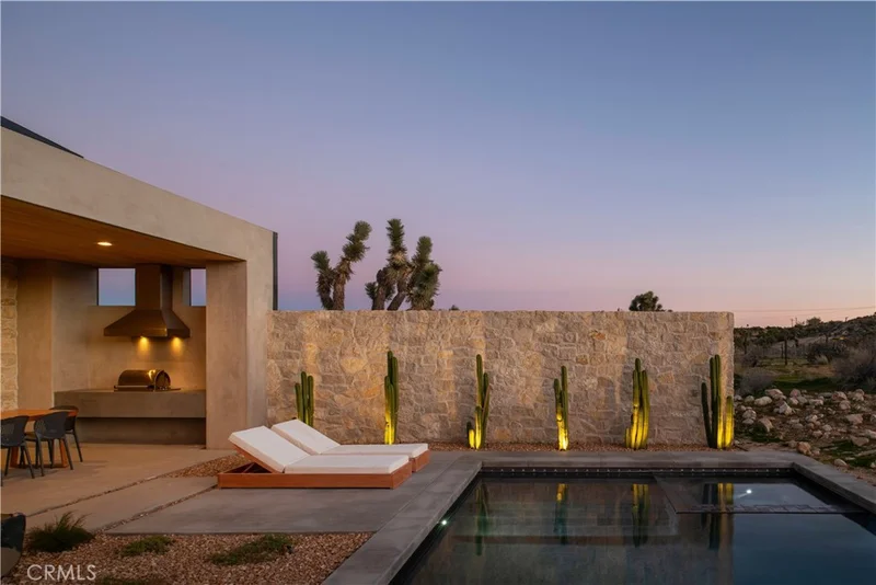 Architecturally significant and quietly dramatic, 5047 Brisbane Ave embodies modern desert luxury living. Set on 2.29 acres in a discreet Yucca Valley enclave with minimal traffic and wide-open sky, the property offers rare tranquility without sacrificing proximity to town, hiking trailheads, and local amenities. Completed in 2023, the 3-bedroom, 2-bath residence spans 2,014 sq ft of thoughtfully designed interior living space. Expansive glazing frames cinematic views of Joshua trees, boulders, and distant mountain ranges. Through careful siting and curated landscaping, the pool and bedroom wing feel quietly protected - a rare architectural balance of privacy and neighborhood ease. Inside, refined materials and quiet luxury define the home. A chef’s kitchen with Miele appliances and Dekton surfaces flows into open living spaces accented by Delta Millworks ceilings, custom doors, and a sleek Ortal fireplace. Spa-like baths feature concrete vanities, curated fixtures, and a freestanding tub ideal for seasonal stays and slow mornings. Dual HVAC zones and high-performance systems ensure year-round comfort. Outdoor living is immersive and intentional: a sparkling pool and spa oriented toward panoramic desert terrain, covered alfresco dining with FireMagic grilling, and layered desert landscaping that elevates sunset lounging, stargazing, and weekend entertaining under the High Desert sky. Offered fully furnished and turnkey, the property appeals to buyers seeking a full-time residence, luxury second home, or flexible holding with optional income potential. Currently operating as an active luxury short-term rental, it demonstrates demand within the modern architecture segment for those considering 1031 exchanges or passive models (buyer to verify). The home offers curated privacy rather than remote seclusion, a combination many desert buyers now actively seek. A rare opportunity to own a modern desert home where architecture, landscape, and livability converge in one of Yucca Valley’s most desirable pockets.