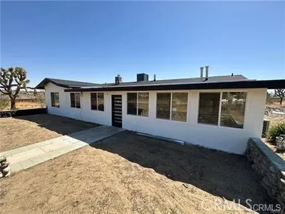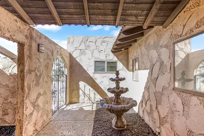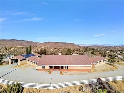 ** Honey Stop The Car! ** The Mount Ridge Estate Is Finally Available! This stunning three-bedroom, two-bathroom Santa Fe home boasts over 2,335 square feet of living space, nestled atop your own private mountain and surrounded by 2.7 acres of prime high desert real estate! The drive to this unique property sets the mood. As you travel through one of the most sought-after neighborhoods, you’ll see well-cared-for homes adorned with lush desert flora and majestic mountains in the backdrop. As you pull up the private driveway, you’re greeted by beautiful boulders, thoughtful landscaping, and a character-driven Santa Fe Adobe aesthetic. Walking through the double-gated courtyard, you’ll realize this is no ordinary home. Inside, you’ll be impressed by the modern open floor plan! Tile flooring, open wood beam high ceilings, and abundant natural light flow through oversized floor-to-ceiling windows, creating an airy feeling throughout. A beautifully designed dual fireplace featuring elegant tile and mid-century rock façades splits the den and large living room. Designed for entertaining, the remodeled kitchen opens to the dining and living areas. It boasts quartz countertops, a mosaic backsplash, stainless steel appliances, a double sink, and plenty of cabinets—perfect for culinary delights! You’ll also find a spacious dining room with a luxurious wet bar outfitted with display cabinets and wraparound tile countertops. Each guest bedroom feels like a primary room and includes ample closet space, built-in desks, ceiling fans, and windows with a view! The guest bathroom features a stylish walk-in tiled shower, dual vanity, and a large mirror. The primary suite is spacious, with high open beam ceilings, a large walk-in closet, and floor-to-ceiling windows showcasing amazing views. The primary bathroom features a dual vanity, a uniquely tiled walk-in shower, and a stunning “Roman” soaking tub! Outside, enjoy incredible panoramic views that rival those of Joshua Tree National Park from the Adobe-textured concrete patio! A private staircase leads to a lookout platform, making you feel on top of the world! Additional features include a large double-door garage, an indoor laundry room, tile roofing, efficient mini-split systems for heating and cooling, ceiling fans, and more! Don’t miss this rare opportunity—call today for your private showing before it’s gone!