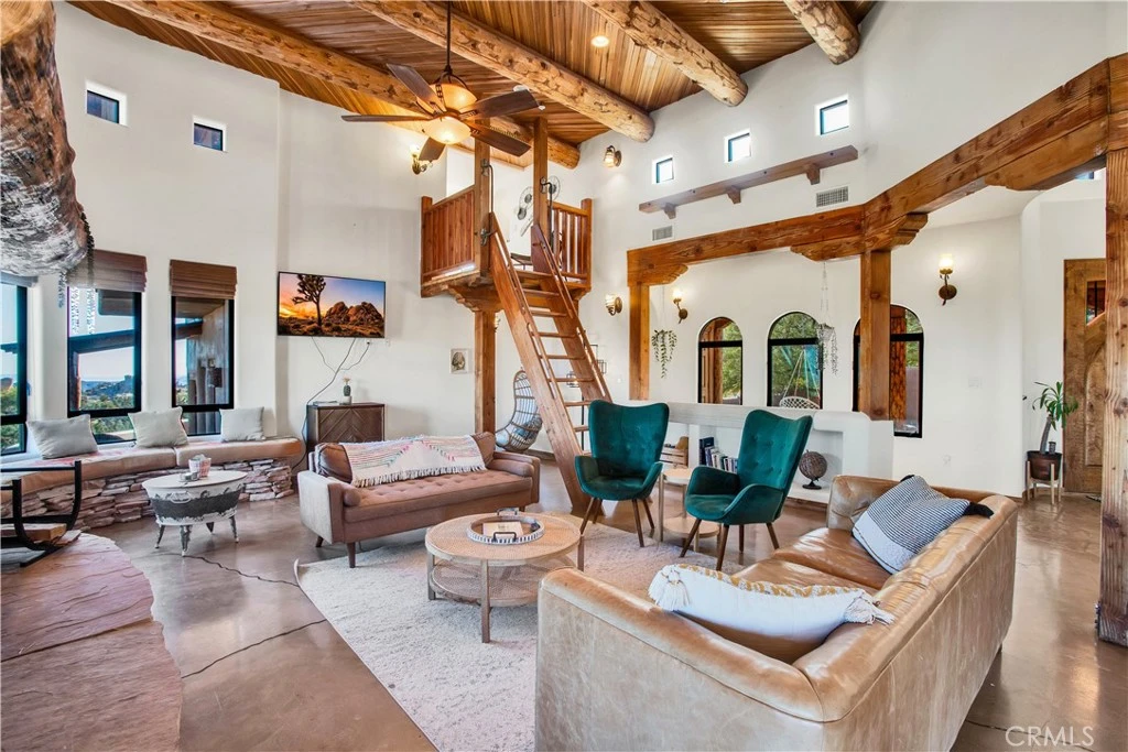 Custom-Built, Fully Furnished Desert Oasis! Welcome to "Sandcastle," a highly successful short-term rental located on just under 2 acres of breathtaking desert landscape, including stunning boulders and Joshua trees. This extraordinary home offers just under 3,000 sqft of living space, featuring 3 bedrooms, 3 bathrooms, a loft with a balcony, and a detached 1,200 sqft finished garage transformed into an entertainment haven. As you arrive, you’ll be greeted by a charming courtyard with flagstone pavers and plenty of seating. Step inside and be in awe of the expansive living room, showcasing an open-concept floor plan, soaring ceilings, and custom wood ceilings with large wood beams. The floor-to-ceiling stone fireplace anchors the space and flows seamlessly into a cozy seating area with breathtaking views. The massive kitchen is a chef’s dream, offering ample storage, counter space, and high-end features like a Wolf stove, a kitchen island with an additional sink, and a custom gas fireplace that adds ambiance at the flip of a switch. The loft above the living room adds charm, complete with a daybed, incredible views, and its own private balcony. The primary suite is truly spectacular, with its grand scale, unique wood beam ceilings, and a massive walk-in closet. The primary bathroom is a retreat, featuring a large soaking tub with incredible views, dual vanities, a no-step walk-in shower with a rain shower head, and a custom rock bench. The second bedroom is equally impressive, offering space for two beds and its own custom bay window. The guest bathroom has been beautifully updated with a luxurious shower. The third bedroom, affectionately known as “The Casita,” has its own private entrance, a spacious layout with patio access, and an ensuite bathroom that exudes elegance. Step outside to a spectacular back patio where you’ll find endless seating areas, a custom stucco outdoor fireplace, and an outdoor spa perfect for stargazing. The desert vistas, boulders, and Joshua trees create a tranquil setting. The detached 1,200 sqft garage has been transformed into an entertainment area complete with a projector for movie nights, games, and space for everyone to enjoy. This home is being sold fully furnished, making it ready for immediate enjoyment or continued success as a short-term rental. With its one-of-a-kind design, luxurious finishes, and incredible location, homes like this are truly rare. Experience the magic of "Sandcastle" for yourself!