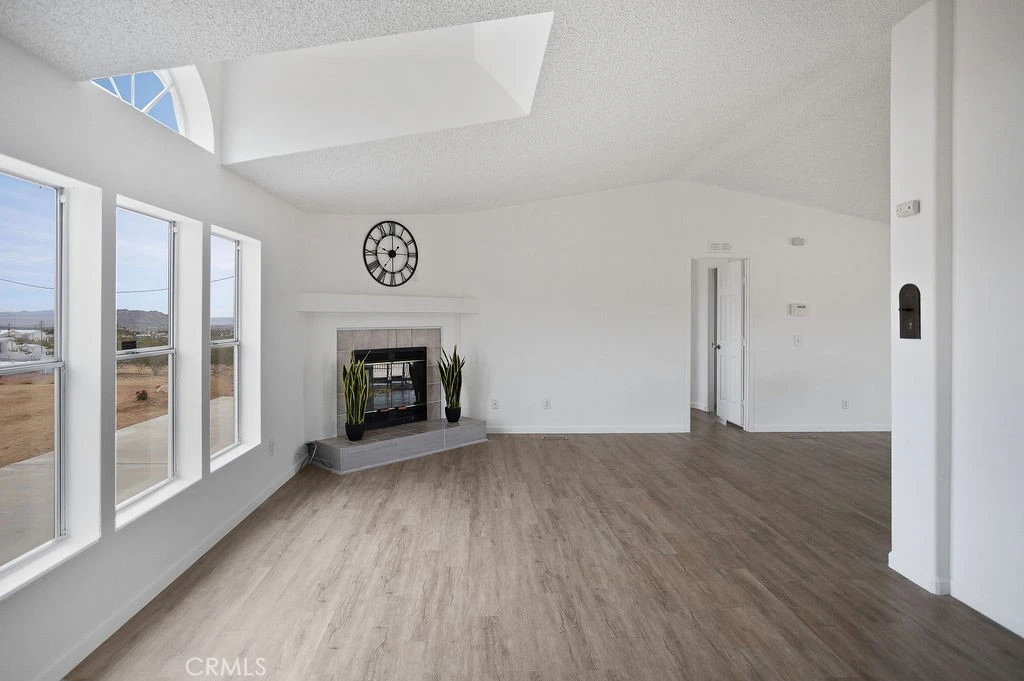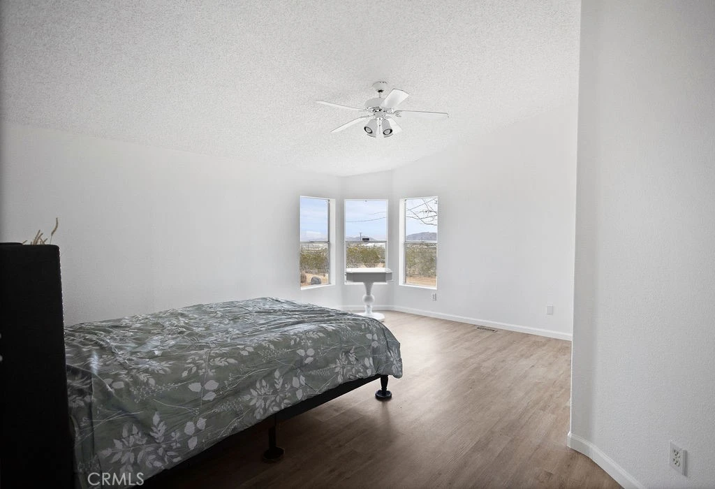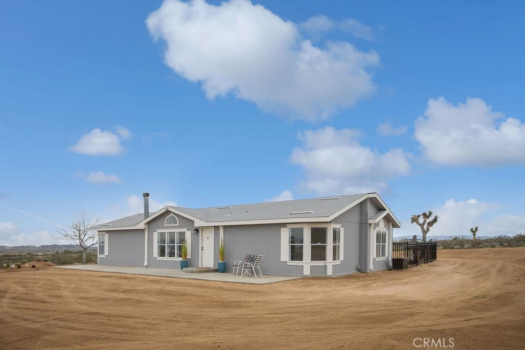 Manufactured home on permanent foundation situated on 5 acres in Yucca Valley’s West Flamingo Heights area. Built in 2000, this 3-bedroom, 2-bath home offers 1,573 square feet with a desirable split floor plan and high cathedral ceilings throughout. The living room features a wood-burning fireplace and ceiling fan, with an open layout connecting to the dining area and kitchen. Kitchen includes a propane range, refrigerator, pantry, kitchen island, and ample cabinetry. The primary suite offers a walk-in closet and en-suite bath with dual sinks, soaking tub, and separate walk-in shower. Additional bedrooms are positioned for privacy. Laundry room includes washer hookup and gas dryer hookup. Central heating and air conditioning provide year-round comfort. The home is serviced by an owned propane tank. Exterior features include concrete surrounding the home, covered patio area, and full chain-link fencing around the 5-acre parcel. Enjoy expansive desert, mountain, and panoramic views. Property is located in an unincorporated area of San Bernardino County. Buyer to verify all utilities, land use, zoning, permits, square footage, and features to their satisfaction.