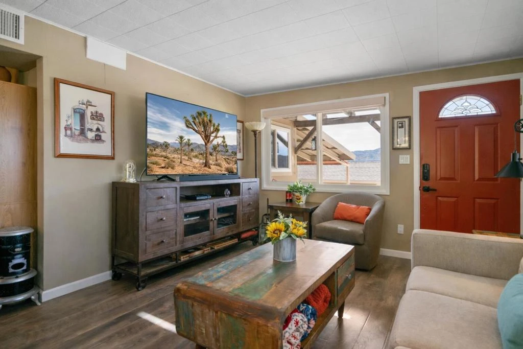 Wonderful two-bedroom, two-bath home offering a rare blend of comfort, functionality, and serene desert living. Step into your own private backyard oasis, complete with a beautiful pond and waterfall--perfect for unwinding with an afternoon cocktail or enjoying peaceful stargazing under the desert sky. A built-in barbecue island connected to natural gas makes outdoor entertaining effortless, while the thoughtfully maintained three-foot-deep pond, serviced monthly by a professional pool company, offers a refreshing escape during warm summer months.Inside, the charming interior features a well-designed layout with two bedrooms, two bathrooms, a welcoming breakfast nook, and an oversized laundry room with direct access to the side yard. This area includes a covered patio, additional parking, and two storage sheds adjacent to the detached, oversized garage with air conditioning, a dedicated electric vehicle charging station, and a large, oversized covered carport--offering exceptional flexibility for vehicles, toys, or equipment.The home is equipped with central heating and air conditioning, evaporative coolers, low-voltage lighting throughout, and is connected to city water, natural gas, and sewer, providing comfort, efficiency, and modern convenience. Recent improvements include new toilets, new stainless steel appliances, stone tile countertops, and automatic window shades.The fully fenced property features three separate gated entrances, a new wood fence along the rear of the yard, and ample parking for four or more vehicles, including dedicated hookups for RVs, boats, or other recreational vehicles. Additional highlights include a newer roof, solar for energy efficiency with minimal electric costs, ceiling fans throughout, and a drip irrigation system with sprinklers supporting lush, established landscaping.Whether you're seeking a full-time residence, a desert retreat, a vacation getaway, or a potential short-term rental opportunity (buyer to verify), this exceptional property truly delivers a private desert paradise you'll be proud to call home. *Select furnishings may be available for purchase outside of escrowBuyer to verify all information to their own satisfaction, including but not limited to square footage, lot size, permits, zoning, use, utilities, solar terms, and any potential short-term rental regulations. Listing broker and seller make no representations or warranties regarding future use or income potential of the propert