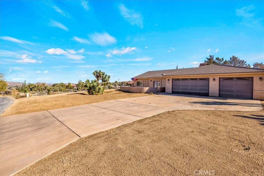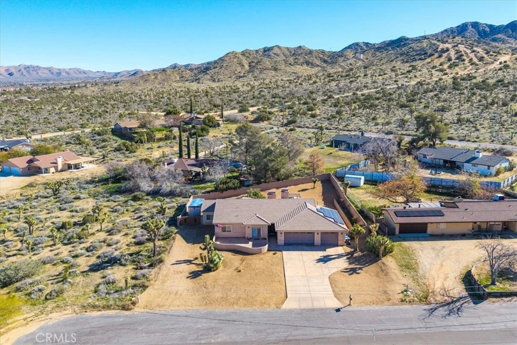 Welcome to 8443 Bannock Trl, a beautiful and meticulously maintained desert home nestled at the end of a quiet cul-de-sac in the desirable Juniper Terrace neighborhood of Yucca Valley. This stunning home features 2,700 square feet of living space with 3 bedrooms, 3.5 bathrooms, *PAID SOLAR* and numerous upgrades throughout. As you enter into the home's Great Room you'll find high ceilings with recessed lighting, earth-toned tile flooring and several large windows that let in an abundance of natural light. The living room is anchored with a cozy wood-burning fireplace and flows effortlessly into the kitchen and formal dining area. The well appointed kitchen is complete with granite countertops, amble cabinet space, a walk-in panty and stainless steel appliances (including 2 ovens, a built-in microwave and a wall mounted pot filler). Just off the kitchen is additional living space that could be used as a family room, den or game room with the existing pool-table available to convey. The spacious primary bedroom features a gas fireplace, large walk-in closets, a private patio door leading directly to the backyard and an ensuite bathroom with a dual sink vanity, soaking tub and separate walk-in shower. The 2 additional rooms are of generous size and include carpeted floors, ceiling fans and full en-suite bathrooms, complemented by an additional half bath for guests. Practical features include a laundry room, linen and coat closets, and a built-in office area ideal for remote work or study. Outdoor living is just as impressive with a front courtyard accessible from one of the secondary bedrooms, a fully enclosed backyard with split-face block walls, RV parking, and an electrical hookup for a spa. Not to mention the oversized 3-car garage, cement tile roof, seamless exterior gutters and the HVAC and water heater were both replaced in 2020. The undeveloped neighboring parcel provides a peaceful desert setting with room to live, work and entertain. Come take a look & let this home's charming allure do the rest, your new desert home or weekend retreat awaits!